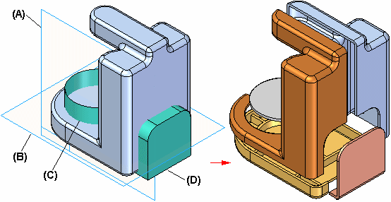The Divide Part command allows you to split one part into multiple parts using a reference plane (A) or construction surfaces (B), (C), (D). Each new part is a base feature in its new document, and the new part documents are associative to the original part.