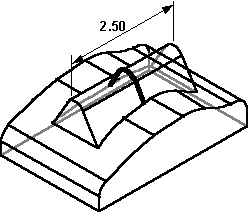 The next figure shows an open profile extruded symmetrically a finite distance on both sides of the profile. Notice that the Distance value is the total extent of the extrusion. Notice also that the ends of the profile are extended to meet the curvature of the part face.