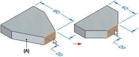 Adjacent faces (A) are extended or trimmed as required, but will maintain their original orientation. The size of the selected face can change.