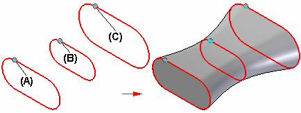 When defining a loft feature using a periodic cross section, such as a circle, ellipse, or some types of b-spline curves, you do not need to define a start point for that cross section. When you select a cross section without vertices (B), Solid Edge evaluates the cross section with respect to the start points on adjacent cross sections with vertices (A) (C).