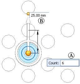 The Instance Count spacing option provides control of how many occurrences count box (A) per ring. The radial spacing of occurrences is controlled with the (B) value box.