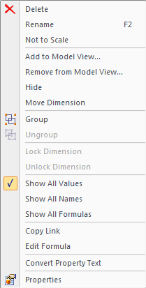 The commands you use to add PMI elements to 3D model views, remove PMI elements from 3D model views, and show and hide PMI elements are also located on the shortcut menu of a selected dimension or annotation in PathFinder: