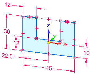 You can add dimensions and geometric relationships to control the size, shape, and position of the sketch elements. You can also place dimensions and geometric relationships relative to the primary axes of the coordinate system. This can be especially useful for symmetric parts during later design modifications. For example, the 10 mm and 22.5 mm dimensions were placed relative to the X and Z axes of the base coordinate system.
