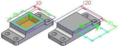 If you construct a ordered cutout in a part, then edit the cutout dimensions such that no material is removed from the model, the feature fails. Solid Edge determines that this is an invalid condition for a cutout feature, and the Errors command button is activated. For example, if you edit the 10 millimeter dimension to 120 millimeters, the cutout feature will no longer remove material from the part.