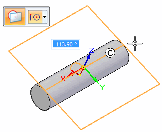 When placing a hole on a cylinder, press F3 as the cursor moves over the cylinder. The Tangent plane command activates. You can position tangent plane by dynamically dragging or by entering an angular value and then press Enter. Once the tangent plane locks, you can drag the hole over the tangent line (C) and the hole locks to the tangent line.
